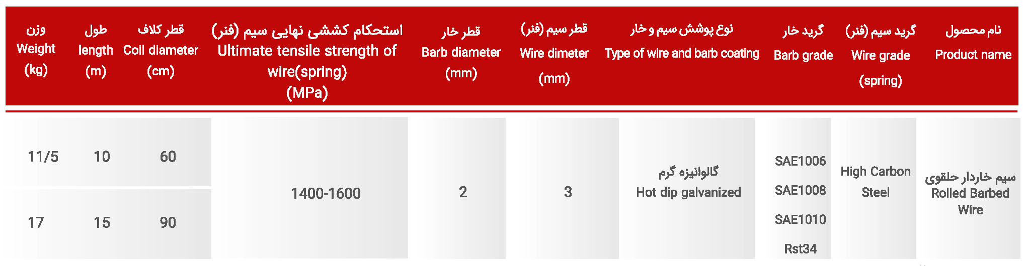 این نوع سیم خاردار دارای خارهای سوزنی و ساخته شده از مفتول گالوانیزه است که مفتول میانی آن از فولاد پرکربن بوده و معمولاً در قطرهای ۶۰ و ۹۰ سانتیمتر تولید میشود.